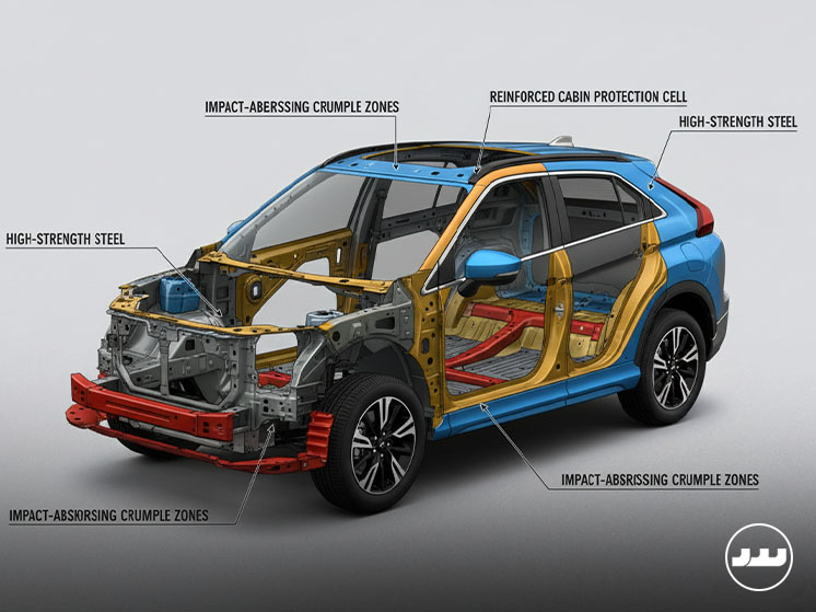 اکلیپس کراس در بخش ایمنی و رفاه، مجموعهای از فناوریهای روز را در اختیار دارد. شاسی آن بر پایه ساختار ایمنی RISE (Reinforced Impact Safety Evolution) طراحی شده است که انرژی ضربه را در تصادف به نواحی غیرحساس منتقل میکند.